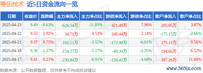 4月23日的资金流向数据方面,主力资金净流出626.54万元,占总成交额11.83%,游资资金净流入421.49万元,占总成交额7.96%,散户资金净流入205.05万元,占总成交额3.87%。